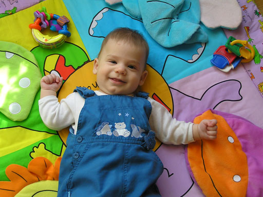 Ma hivatalosan is felavattuk a Magdiéktól kapott játszószőnyeget, leterítettük a parkettára és rátettük Levit. Egyből lekötötték a szőnyegen található színek és a formák, elmélyülten szemlélte őket, meg persze egyből kipróbálta rajta a repülőzést is.
