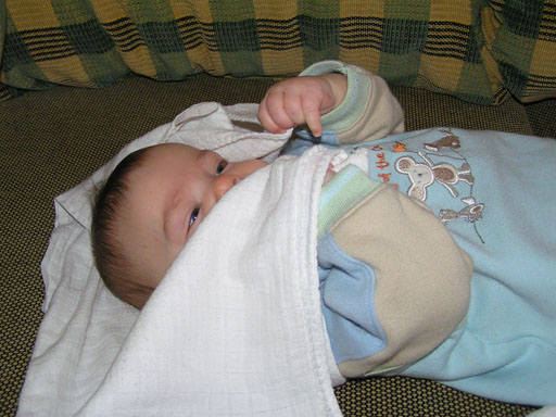 A nagy játékban elfáradva nagyot szundít délután és általában mire Andris megjön addigra szokott felébredni. Ekkor jön a férfiak beszélgetése az élet nagy kérdéseiről és néha ha megengedik, akkor én is csatlakozom hozzájuk. Este 9 órakor következik a fürdés Apával, én ilyenkor csak asszisztálok, és persze az én dolgom a vetkőztetés, a fürdés utáni törülközés és éjszakai hálóruci felöltése. Ilyenkor már elég fáradt, amint leteszem pár perc méltatlankodás után már alszik is. Az éjszakát is nagyjából végigalussza már, hajnali 5 óra körül van már csak egy etetés, aztán alszik tovább reggelig. Persze egy kisbabánál egy állandó dolog van a változás, ezért általában minden változik, van hogy annyira kifárad, hogy hajnalban fel se kell és alszik reggelig. De olyan is van, hogy reggelig még kétszer ébreszt fel, hogy éhes. A képen éppen alvás után próbál magához térni, azért ez bamba tekintet.