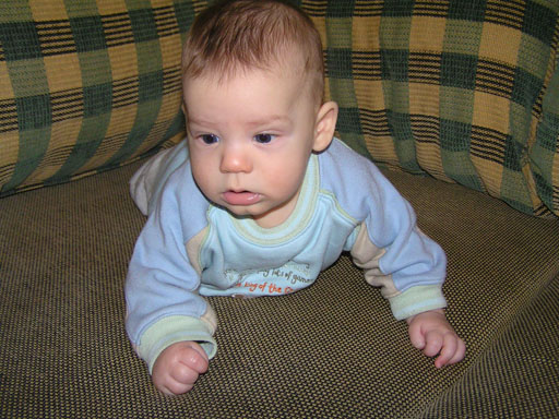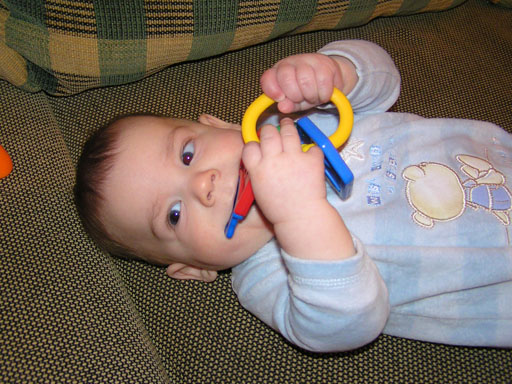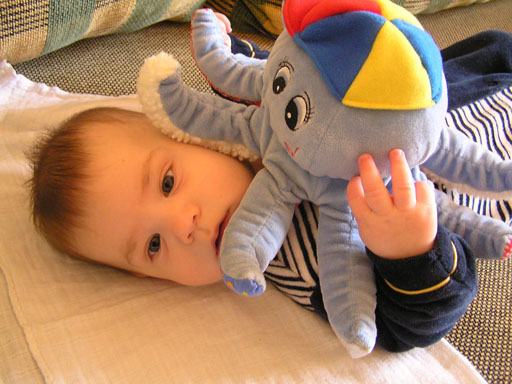 Lábemelgetésben már profi. Emelgeti, ha játszom vele vagy amikor jókedve van és persze közben szopogatja és rágcsálja valamelyik ujját a sok közül.