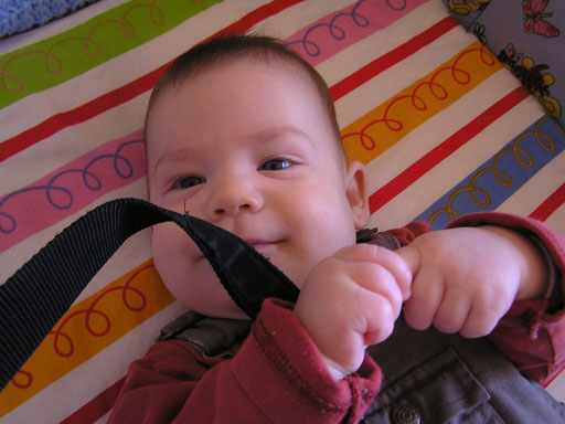 Rövid pelusos rágcsa után, ha van kedve vadul pörgeti a babatükröt és rángatja a katicát vagy csak szemlélődik, nézi mit teszek-veszek körülötte vagy eljátszik egyedül a kiságyban. Mint minden lelkes anyuka, én is próbálom megörökíteni a nagy pillanatokat, de sokszor nem vagyok elég fürge és mire előkapom a fényképezőgépet, már sehol a mosoly, a láblengetés vagy a vicces póz. Kifigyelte, hogy fényképezéskor a gépről lelóg a szíja, így amikor nem figyelek rögtön elkapja és ha nem vagyok elég gyors már a kezében a zsákmány, amit vigyorogva próbál a szájába venni, ami eléggé megnehezíti így a fotózás.