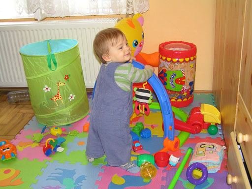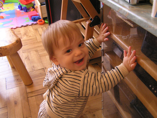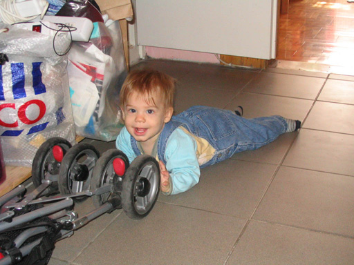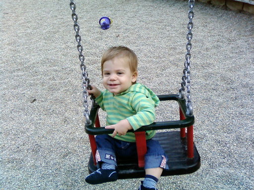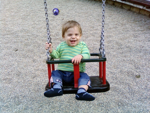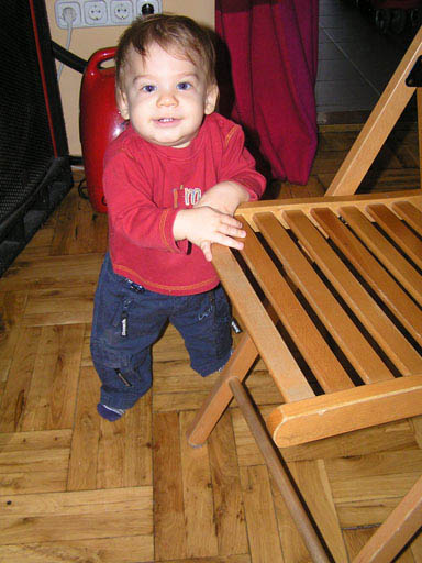 Már nagyon ügyesen tud állni, simán elálldogál 5-10 perceket is, sőt tovább fejlesztette az ácsorgást és ügyesen már kapaszkodva lépeget a bútor mellett is. Közben szórakoztatja magát, magyaráz, hadonászik, csak akkor nyűglődik, ha már nagyon elfáradt és nem bír leülni, ilyenkor jön anya, a felmentő sereg és segít leülni a fenekére. Szeptember 10. Pár napja már nem csak felhúzza magát és áll a szék mellett, hanem tolja maga előtt a széket és lépeget utána, nagyon édes, ahogy komoly arccal koncentrál és vonul át a szobán székestül. De eltolja a porszívót is ugyanezzel a technikával. Kezd kiütközni fiús mivolta, autó tologatás közben rájött, hogy valamitől gurul az a kocsi, felfedezte, hogy az autóknak van kereke is. Azóta minden autónak a kerekét forgatja, sőt rájött, hogy a porszívónak is van 3 kereke (nekem sose tűnt fel eddig:) az is nagy kedvenc azóta, képes perceken át tekerni a kerekeket. Persze ne feledjük régi kedvencét a babakocsit se, azért minden nap annak a kerekeit is megpörgeti, ha elkúszik mellette. Szeptember 19. A rágófogak lassan de biztosan jönnek, csak elakadtak valahol az ínye alatt. Néha fáj neki, olyankor megy a sírás-rívás pár percig, aztán mintha elvágták volna. Viszont rájött, hogy a fogait prímán tudja kocogtatni, nagyon tetszik neki, nekem már annyira nem, ez amivel engem ki lehet kergetni a világból. mióta rájött, hogy a babakocsit nem csak tolni lehet, hanem a kerekeit is lehet tekergetni azóta még nagyobb kedvenc lett a kocsi, persze, hogy utána hogy néz ki a keze, azt inkább nem mondom, ilyenkor megyünk a fürdőszobába kezet mosni, ami nagyon tetszik neki, lehet pancsolni és csapkodni a vízsugarat és még a kéztörlés is izgi dolog. Szeptember 23. Levinek új kedvence van; egy golyós tologatós játék. Már régóta gondolkoztam, hogy kéne venni egyet, mert Judyéknál is játszott vele. Az IKEA-s elég drága és annyira nem is tetszett, mert azon csak sima golyók vannak. Ezt végül a vaterán találtam, teljesen új és kb. harmada volt az IKEA-snak és sokkal aranyosabbak rajta a formák is. Ezen fából készült, pici festett különféle közlekedési formák és eszközök vannak. Persze nem úgy használja, mint a nagyok, egyelőre még csak lelkesen forgatja és tologatja a formákat az ujjával. Nincs rosszabb egy beteg gyereknél, mondják, így igaz. Sajna Levi is megfázott, szerencsére csak taknyos, láza nincs és jó a kedélye is. Persze az alvás így betegen se nagyon megy, éjszaka párszor felsírt, mert totál bedugult az orra és hiába szívtuk ki porszívóval, egy idő után megint eldugult. Szeptember 26. Ma sétáltunk Lili barátnőmmel egyet az kora őszi napsütésben és természetesen útba ejtettünk egy játszóteret is, ahol Levi hintázott egyet. Nagyon élvezi, hogy mozog alatta a föld és közbe azért lehet nézelődni is. Mindig szívesen nézi a többi gyerkőcöt, hogy ki mint csinál körülötte. A képen is azért van kifordulva mert a mellette hintázó kislányt nézi.
