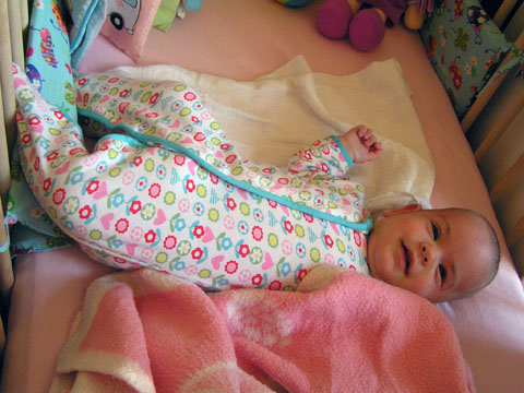 Iza baba már nagyon mozgékony percek alatt megfordul már a hátán a kiságyban. Most is éppen keresztbe fekszik, és a lábát feltette a kiságyban lévő rácsvédőre. Amit csak megkaparint a kezébe azt meg is kóstolja, a takaró az egyik nagy kedvenc. Ezt a rózsaszín takarót Judit barátnőm kislányától Anditól örököltünk meg. Szereti nagyon az esti fürdést is; csapkod a lábaival és szereti ha a pocakjára öntjük a vizet. Még a hajmosás se mossa le arcáról a mosolyt. |