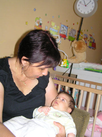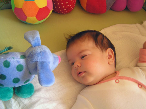 Pár napja nagyon érdeklődő lett. Szeret nézelődni a hátán fekve a kiságyban. Mindent alaposan hosszú perceken át néz, ha tetszik neki a dolog akkor mosolyog is rá.