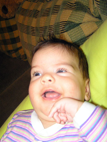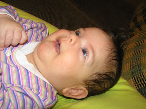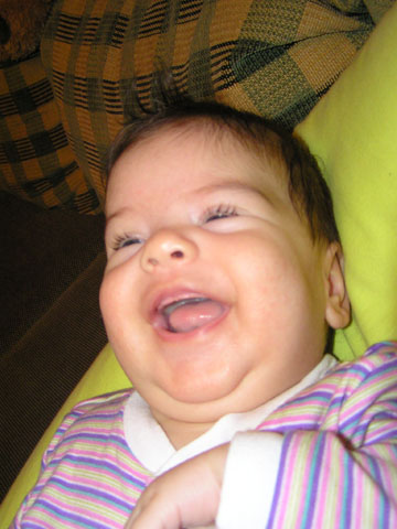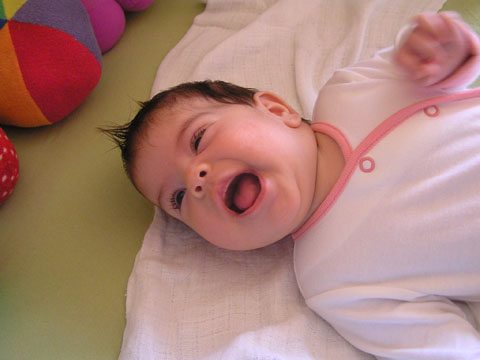 Ha nincs közönsége akkor is elszórakoztatja magát, használja a kezét és a lábát is; kalimpál és hadonászik és nagyokat vigyorog hozzá. Persze a legjobb, ha anya kiveszi és beszél hozzá akkor még szélesebb a jókedve.