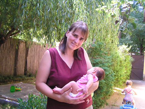 14-én a kertben Lívia barátnőm karjában elalélva Izi (a háttérben Róza triciklizik)