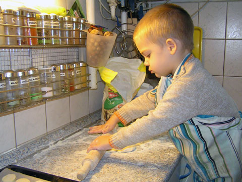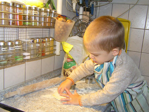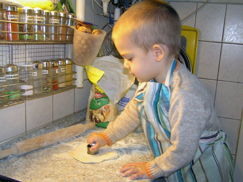 Délután Andris kollégái jöttek hozzánk Iza nézőbe. Töki pompos és krumplis pogácsa volt a menü. Levi mint mindig most is lelkesen segített főleg a kóstolgatásban. Kemény küzdelem árán sikerült csak a angol szalonnát és a reszelt sajtot megmentenem a pomposba. Aztán mondtam neki, hogy sütünk pogácsát, na akkor hajlandó volt abba hagyni a csipegetést és Ő is nagy elánnal vetette bele magát a pogácsa elkészítésébe. Megkapta a kötényemet, odatoltam a széket és kezdődött a gyúrás. Anya sodrófáját is kölcsönvehette a nyújtáshoz, kicsit lisztezett, mint ahogy tőlem látta, miután a gyúráson most is gyorsan túljutott, azt nem szereti annyira.