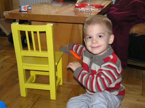 Levi fűrészeli a kis székét a játék barkács készlettel, amit Andris kollégáitól kapott ajándékba.