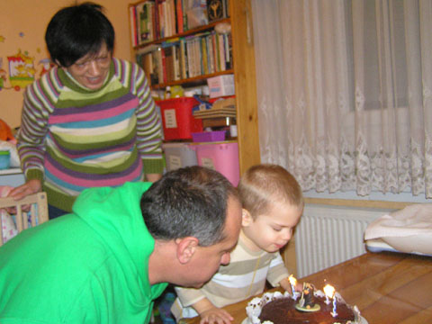 A gyertya trükkös volt, mert nem lehetett elfújni. Levi meg is lepődött elsőre, hogy mi történt, aztán megint elfújta és újra meggyulladt, tetszett neki. Többször elfújta a végén már besegített Sándor is, de csak nem aludt el. Aztán elárultuk, hogy ez olyan gyertya, amit nem lehet elfújni, csak vízben eloltani.