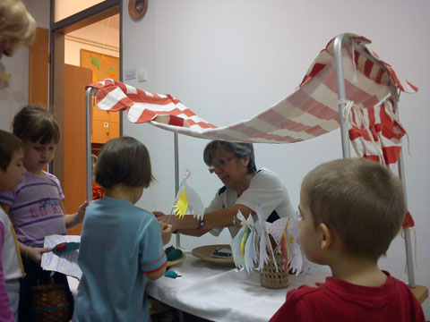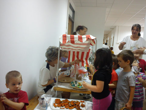 Nagyon cukik voltak a gyerkőcök ahogy az óvonénik és dadusok felügyelete mellett szépen libasorban haladtak végig a folyóson. Minden gyerkőc kapott 5 fabatkát amin tudott vásárolni a többi csoport termékeiből.