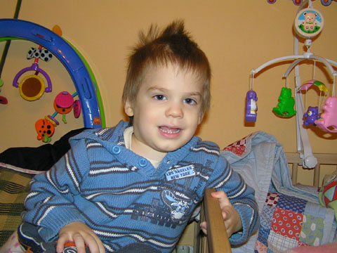 Január 31. Levi haja igencsak megnőtt, ahogy a képen is látható, bár itt punkosnak tűnik a sérója a valóságban a forgóinál össze-vissza állnak a hajszálai. Elkértük Tisóéktól a hajnyíró gépet, de eddig nem engedte, hogy levágjuk a haját. Mostanában amikor Izát fotózom, Levi is mindig kéri hogy Őt is fotózzam le. Ez is egy ilyen kép, ami az Ő kérésére készült róla.