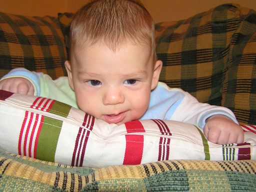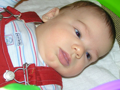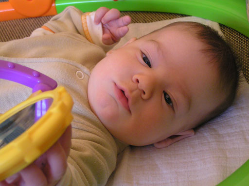 A héten felfedezte a cuppogást, főleg ha már nagyon álmos akkor szokott cuppogni, de büfizés után is gyakran hallom, hogy cuppog a vállamon, nagyon édes ahogyan csinálja. Érdekes, hogy az ujját sose szopta, 1-2 alkalom volt, amikor véletlenül bekapta, de mikor konstatálta, hogy nem jön belőle tej, abbahagyta. Így az ujját nem is szopta, de pár hete észrevettem, hogy alvás előtt szopogatja az öklét néha. Azóta teljesen rákapott, most már ez is az alvási rituálé része. Ha álmos nem mindig sikerül az alvás egyből, ha nem találja az öklét, jön mindig a nyűglődés, a feje alá tett textilpelenka gyűrögetése és szopogatása, de ez se pótolhatja a megszokott öklét. Ha végre megtalálja és sikerül a szájába tömnie, akkor mindig nagy az öröm, és ezt jelzi is hangos cuppogással. Ez mindig használ, utána pár percen belül már jön is az álom manó és édesen szuszog a kiságyban. Amúgy egy igazi kis vagány csibész, elbűvölően tud mosolyogni, mindig levesz vele a lábamról. Mosolyát kiterjesztette a tárgyakra is, mindenre mosolyog, ami tetszik neki, legyen az egy lámpa vagy egy játék. Ezen a képen végre sikerült is elkapnom egy mosolyt.
